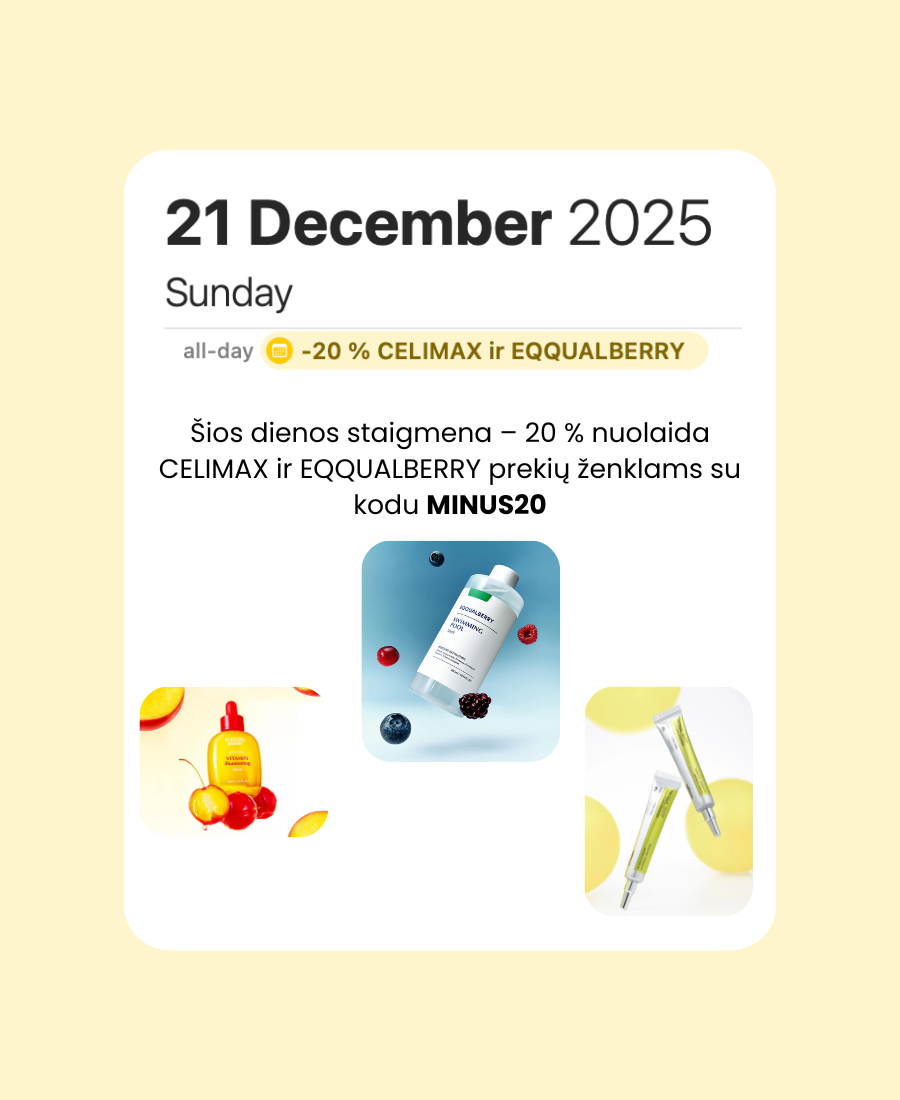 Šios dienos pasiūlymas – 20 % nuolaida CELIMAX ir EQQUALBERRY prekių ženklams su kodu MINUS20