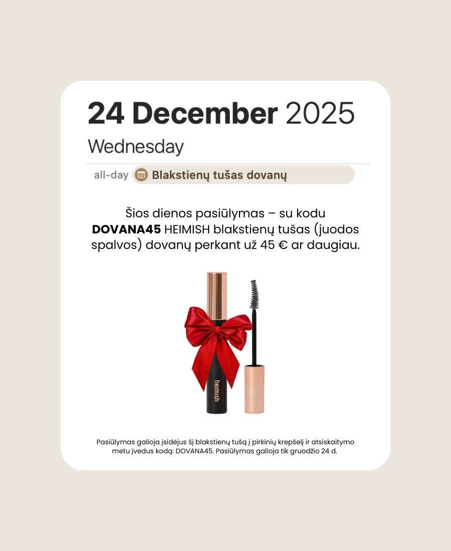 Šios dienos pasiūlymas – su kodu DOVANA45 HEIMISH blakstienų tušas (juodos spalvos) dovanų perkant už 45 € ar daugiau.