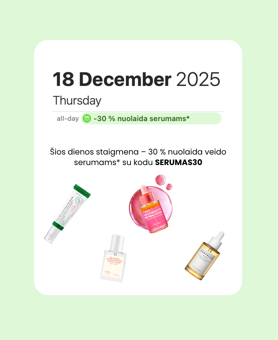Šios dienos staigmena – 30 % nuolaida veido serumams* su kodu SERUMAS30.